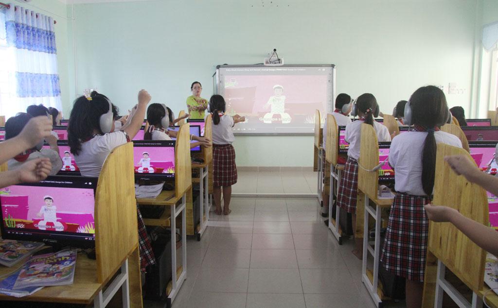 Trong giờ học Tiếng Anh, học sinh thực hành nghe, nói, đọc, viết với sự hỗ trợ của máy vi tính, tai nghe và màn hình lớn trong phòng chức năng, giúp giờ học trở nên sinh động và hấp dẫn. Các phòng học rộng rãi, trang bị đầy đủ thiết bị như màn hình tivi hỗ trợ giáo viên ứng dụng công nghệ thông tin, mang đến những tiết học trực quan và lôi cuốn.